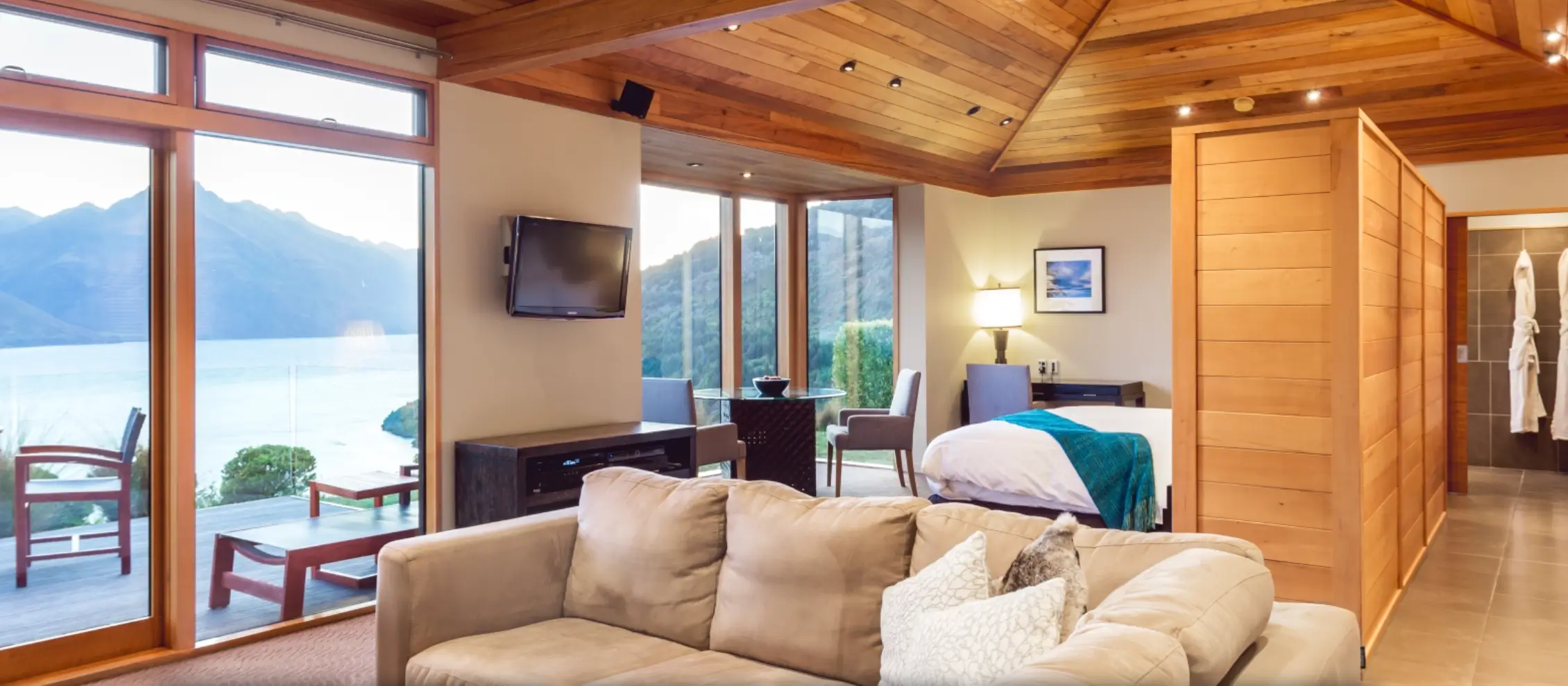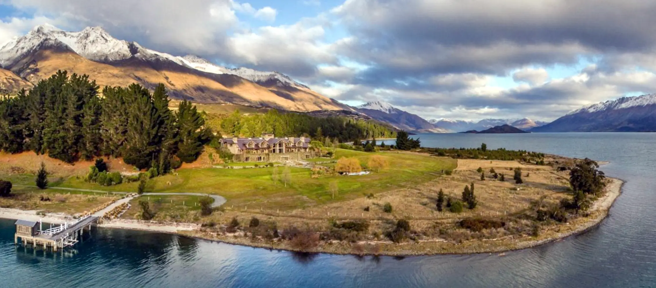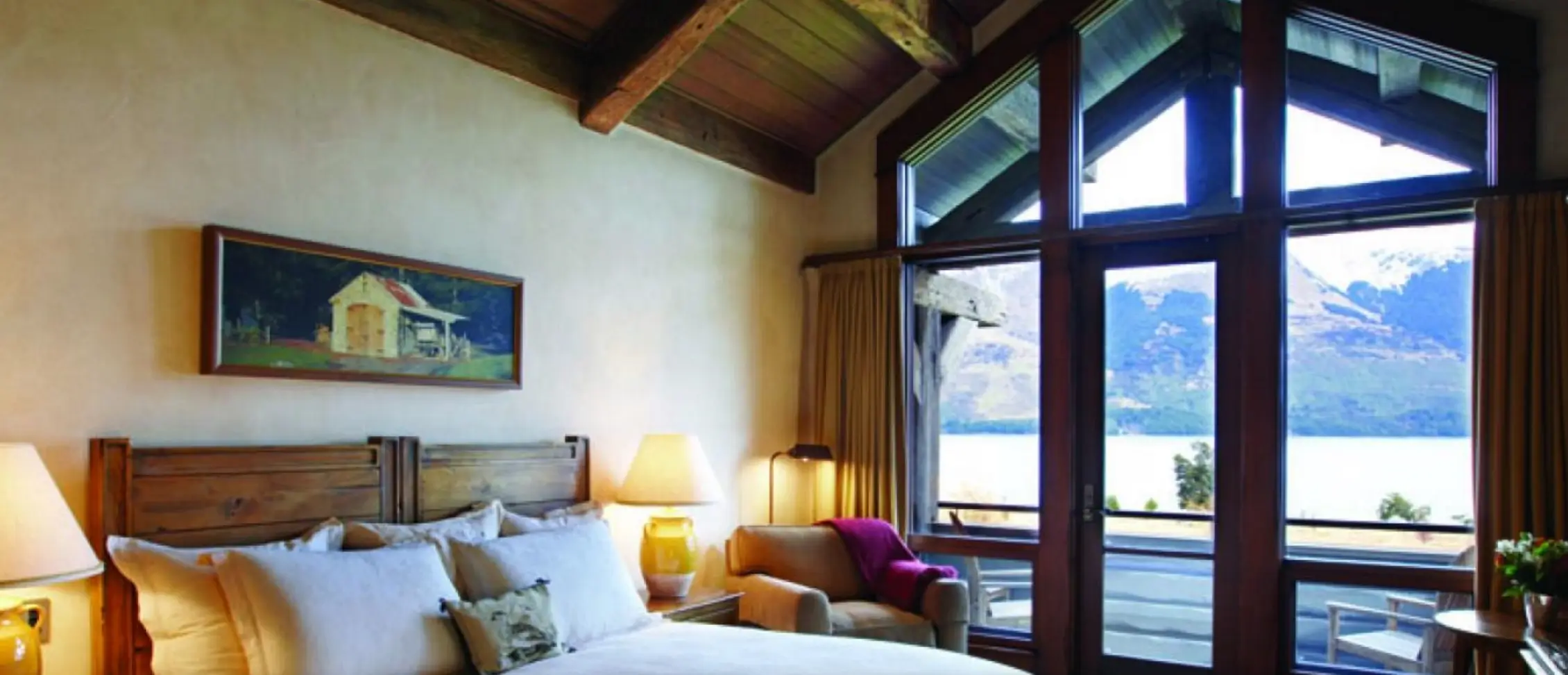 Sitting on the northern end of Lake Wakatipu, 45 minutes from Queenstown,on the edge of the alpine wilderness of Fiordland National Park, Blanket Bay is rustic style lodge with a variety of suites and guest rooms full of natural materials and showcasing the magnificent lake and mountain vistas.