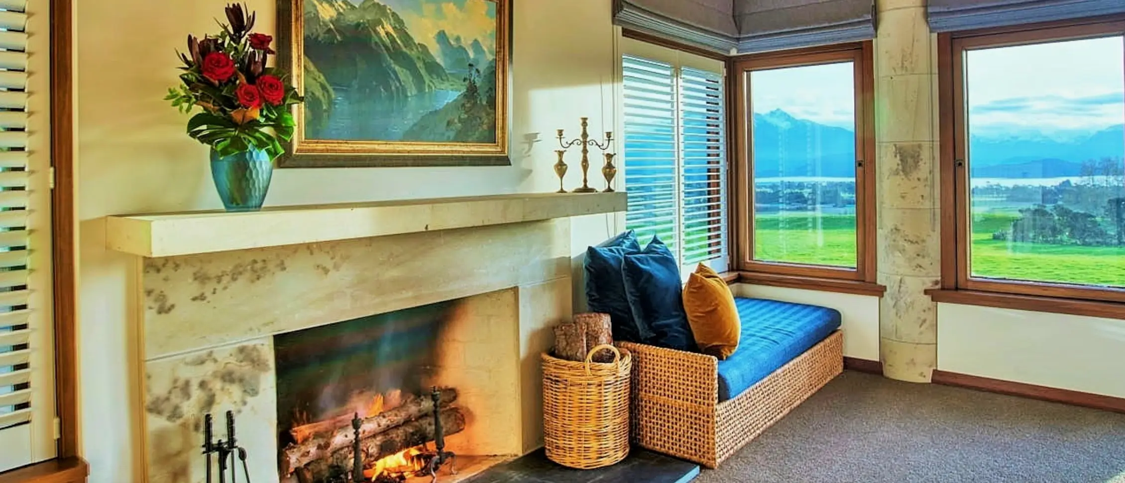 Guests can relax by the 11m high, 2m wide stone fireplace located in the guest lounge whilst taking in the uninterrupted views across Lake Te Anau.