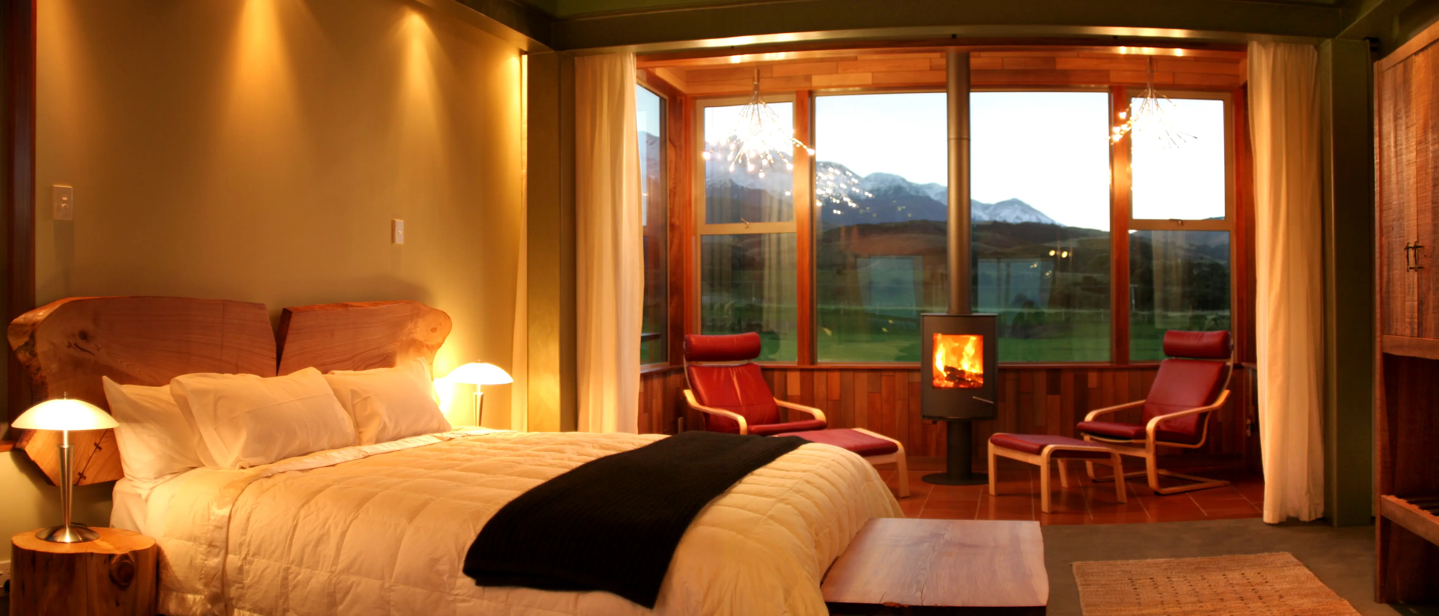All of the Lodge rooms are suites which offer large soaking tubs, king beds and balconies that look over the farm’s deer grazing in paddocks adjacent to the Kaikoura mountains. The lightfilled Hapuku Room is beautifully furnished with fireplace, writing desk and private entrance.