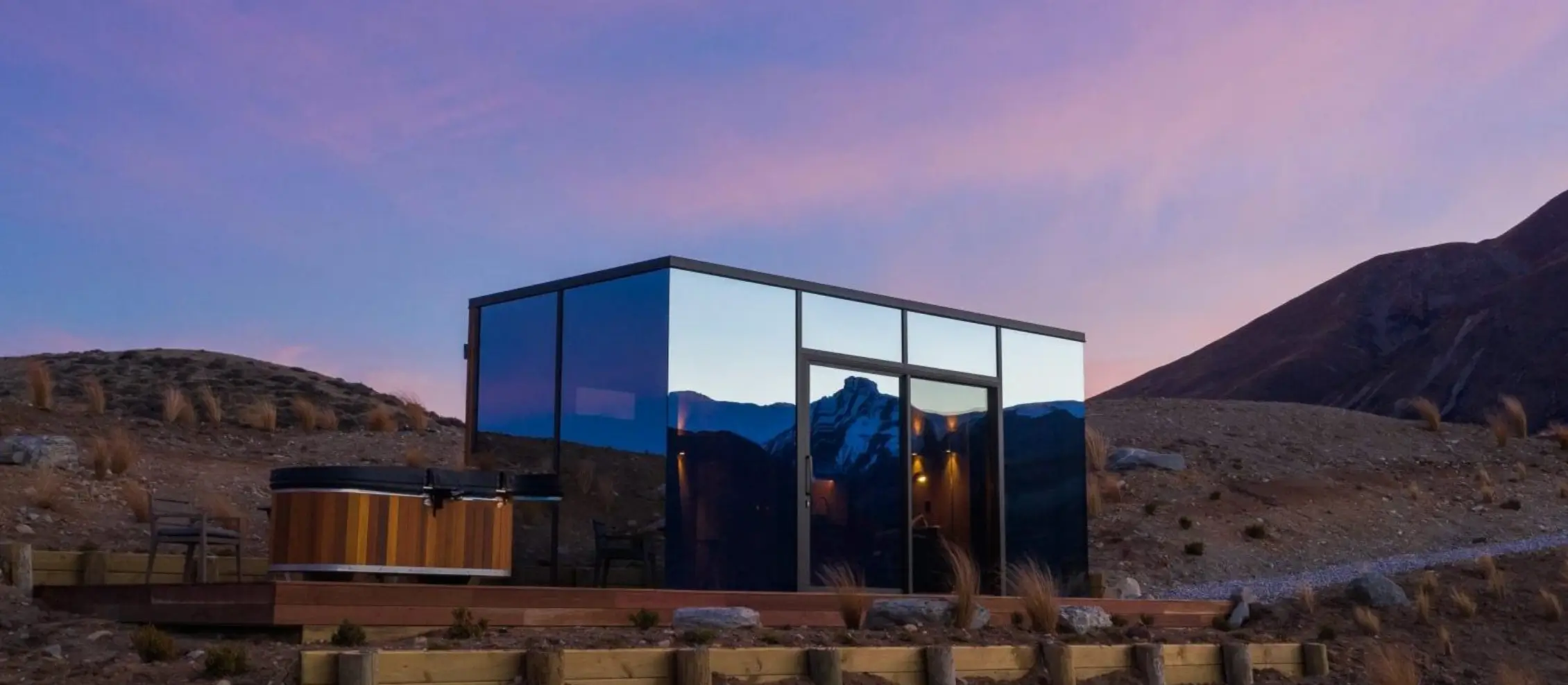 SkyScape sits on a high country sheep station in the Aoraki Mackenzie International Dark Sky Reserve. SkyScape is set in total seclusion, surrounded by farmland and yet it is only 12km from Twizel. It's also a great location for an adventure in Mount Cook National Park.