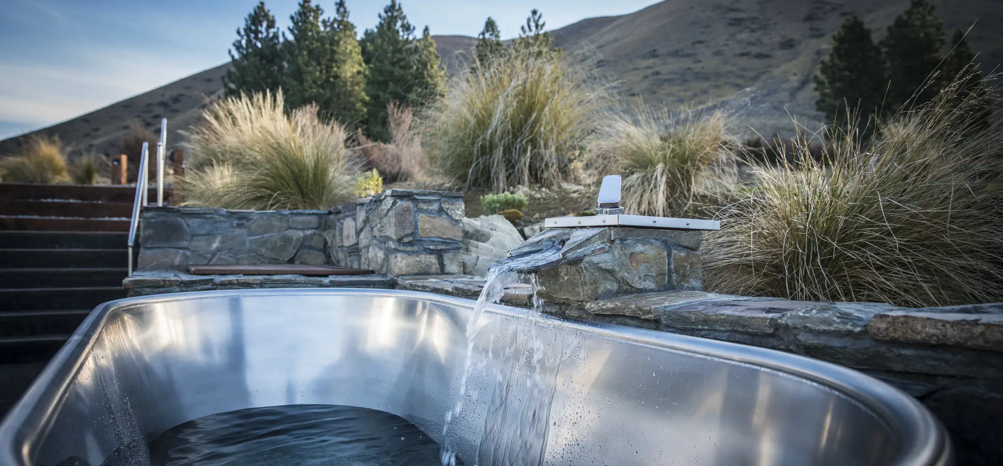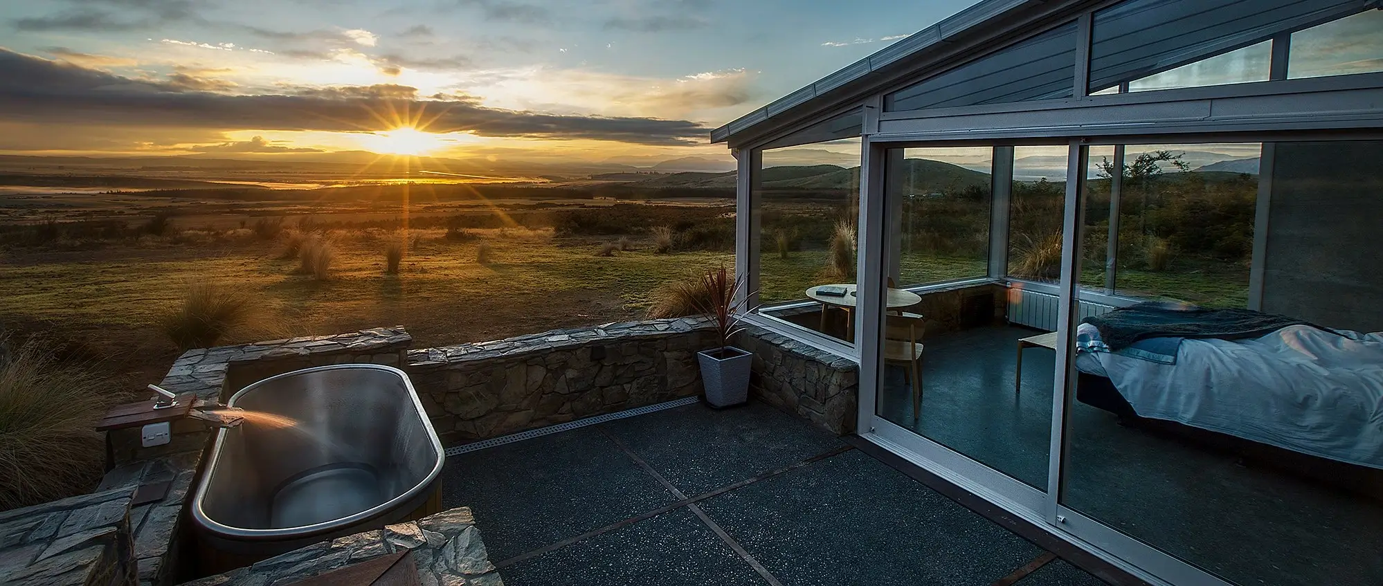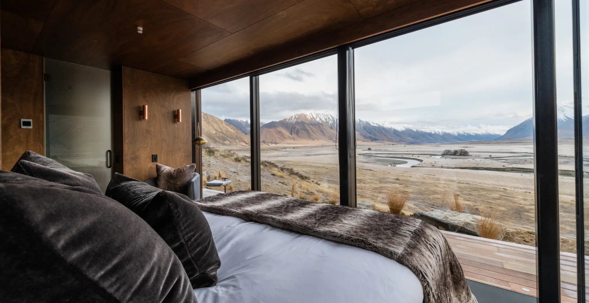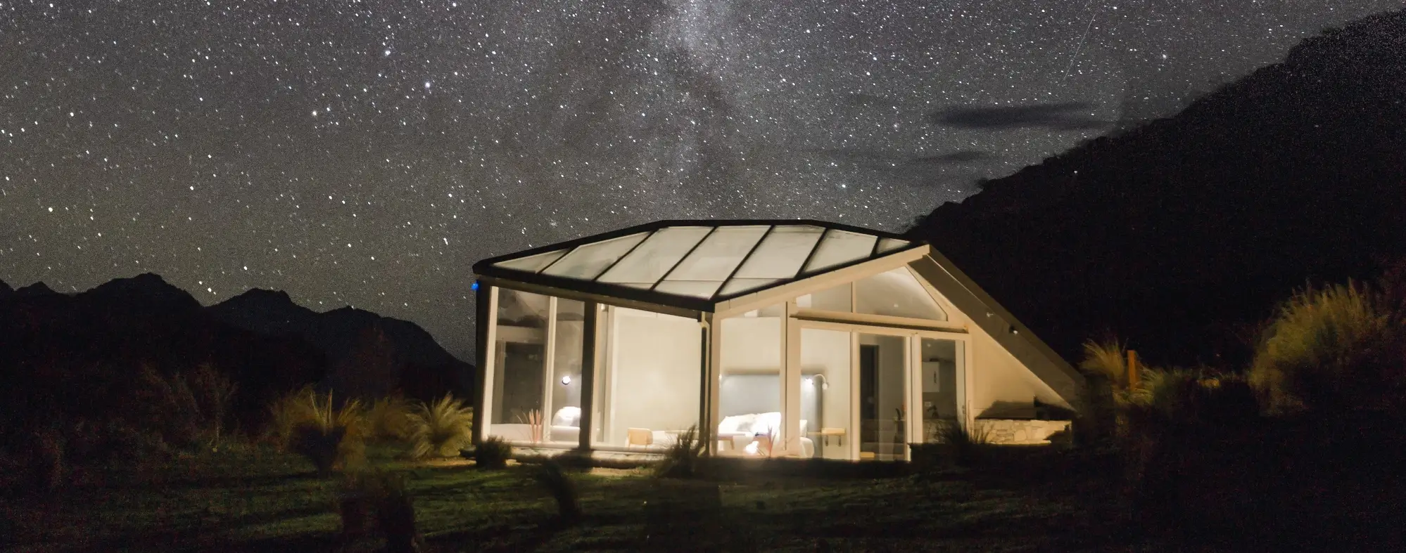 Made predominantly of glass and designed to maximise the extraordinary views of the Mackenzie country by day and night. The cabin has a cedar outdoor bath tub, a king bed and 100% pure spring water sourced from deep under the Ben Ohau Range. Continental breakfast is included and dinner and farm tours are also available on request.